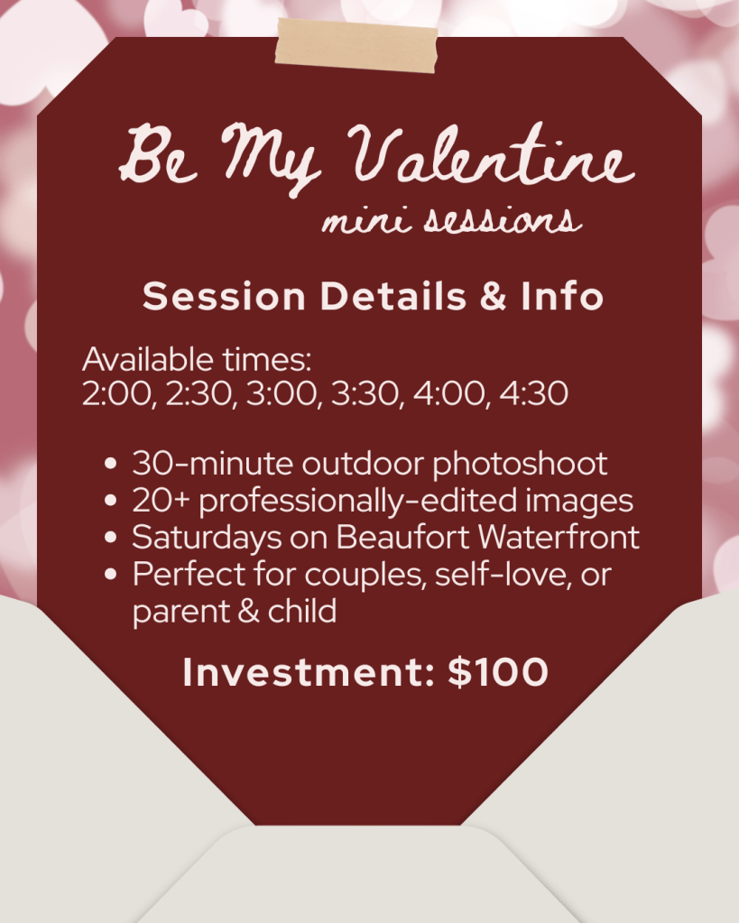 Saturdays are for mini sessions! “Be My Valentine” minis will be available every Saturday in January 2026 on the Beaufort waterfront.